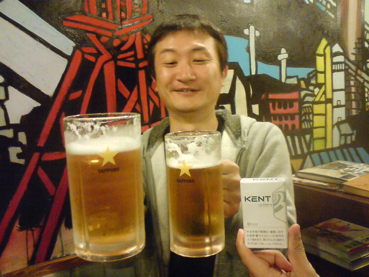 名古屋某居酒屋にて、タバコさん。ド級ジョッキにご満悦。