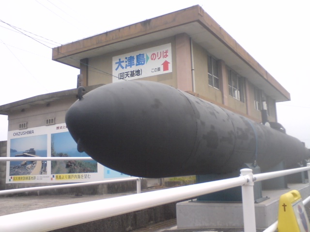銀南商店街の駅向こう側にある港から、この回天を戦時中生産していた大津島に渡れるフェリーがでていまして。そこにこの原寸レプリカがデンッとあるわけです。